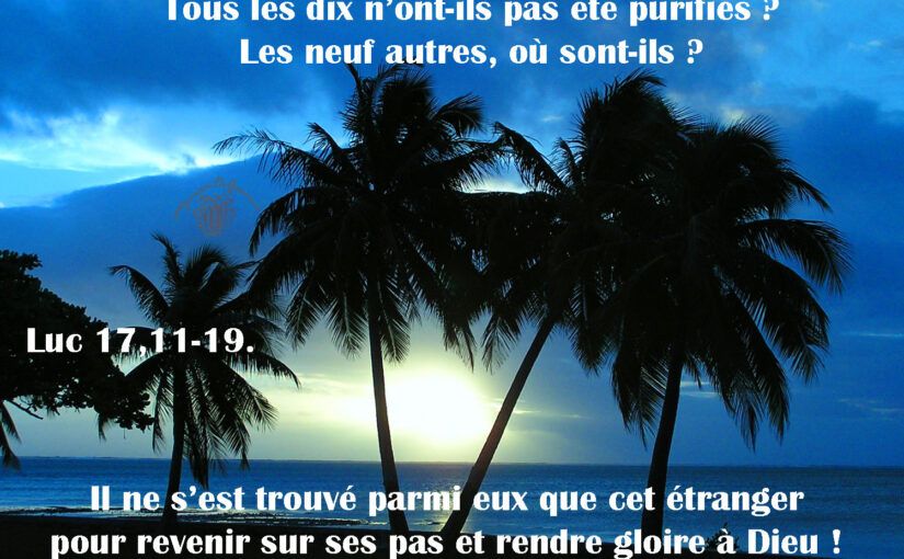 Saint Luc précise que cet homme était un samaritain, un exclu de la communauté juive. Il ne pouvait donc pas aller rencontrer le prêtre. Alors, il revient à Jésus qui l’accueille. Cet événement nous rappelle que le Christ n’est pas venu que pour les gens de son peuple. La mission commence auprès d’eux, mais elle doit se poursuivre dans le monde entier. Elle est universelle. Comme Naaman, le Samaritain revient en glorifiant Dieu. Lui, l’étranger a été le seul à faire cette démarche.
