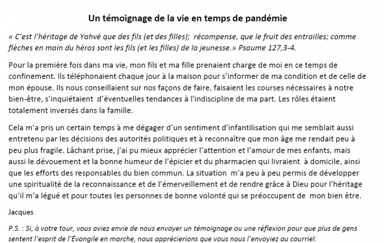 Le Parvis de Québec pense qu’il est bon d’essayer, en ce temps de confinement, de renforcer au moins par des moyens techniques le sentiment communautaire si nécessaire pour vivre notre foi chrétienne. Il est de notre intention de vous contacter, environ une fois par semaine pour vous dire que nous pensons à vous et qu’on aimerait connaître vos questions et interrogations. Voici donc un petit message pour vous :